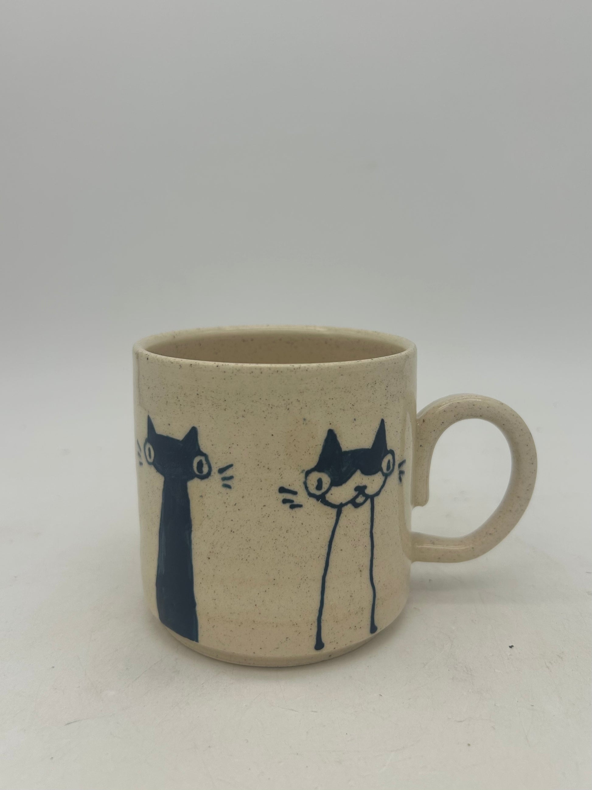 Hand made with white stoneware and painted with blue underglaze. Approx 4.5” in height and 3” in diameter. Food safe and microwave safe, hand washing recommended for longevity! =^-^=
