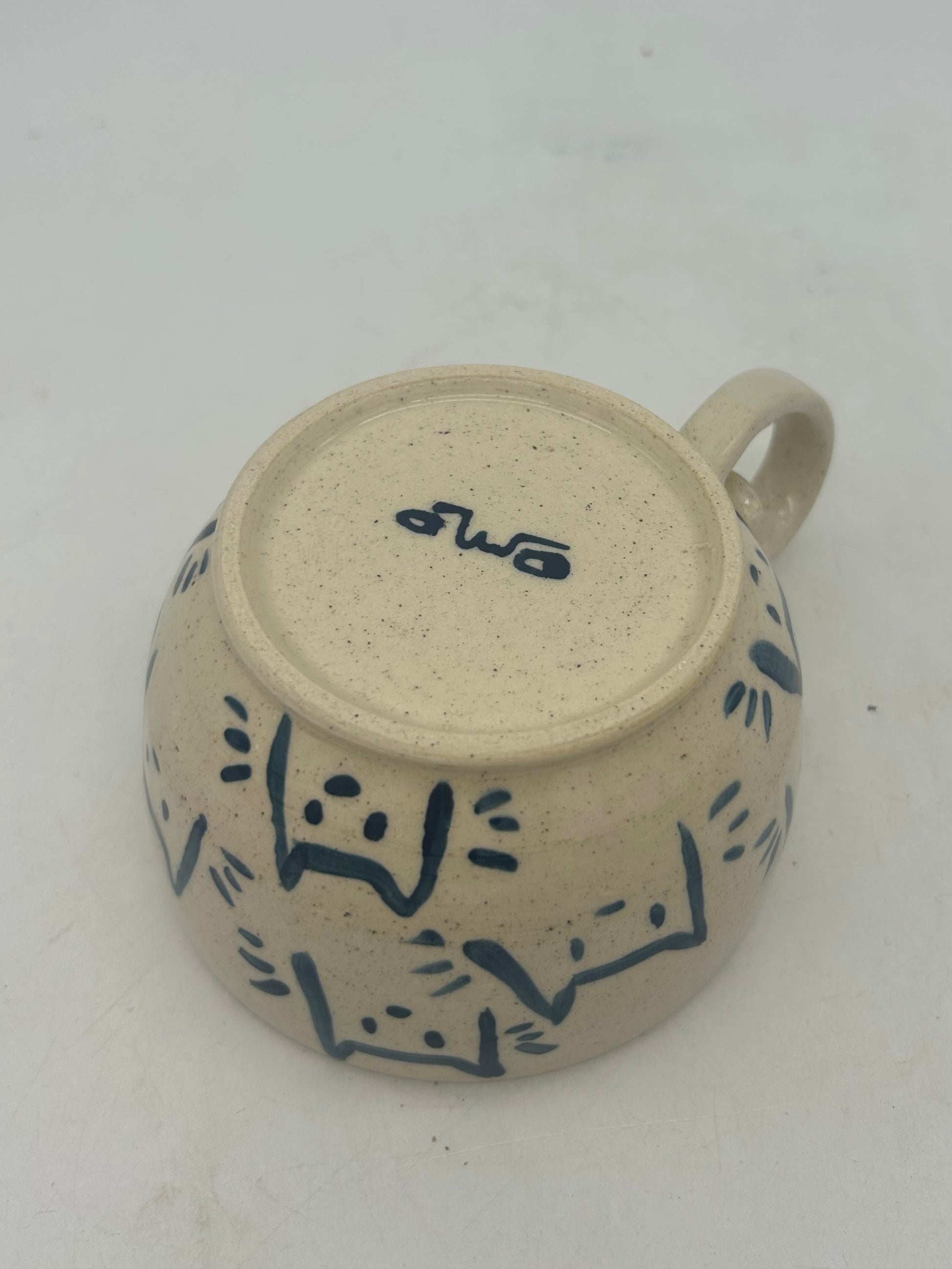 Hand made with white stoneware and painted with blue underglaze. Approx 3.5” in height and 3.5” in diameter. Food safe and microwave safe, hand washing recommended for longevity! =^-^=